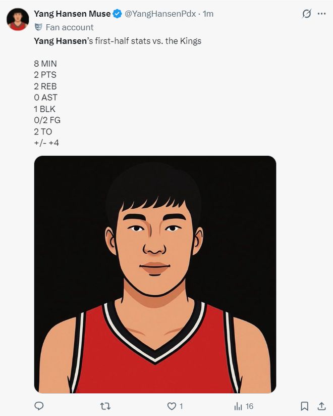 開拓者球迷:開拓者過去12分里有10分是楊瀚森一人拿的。